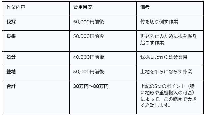 - 面積と密度: 竹林が広く、竹が密集しているほど作業量が増え、費用は高くなります。