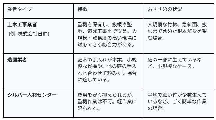 大切な土地を任せる業者選びは非常に重要です。主に「土木工事業者」「造園業者」「シルバー人材センター」など選択肢がありますが、どのタイプを選ぶにしても、以下のポイントを確認することが失敗を防ぐ鍵です。