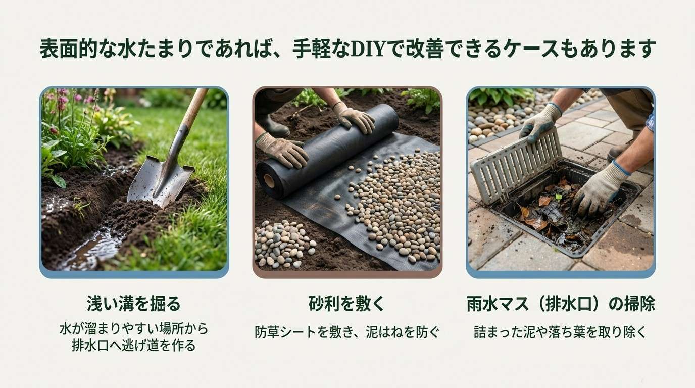 表面的な水たまりであれば、水の通り道を作ってあげることで改善する場合があります。